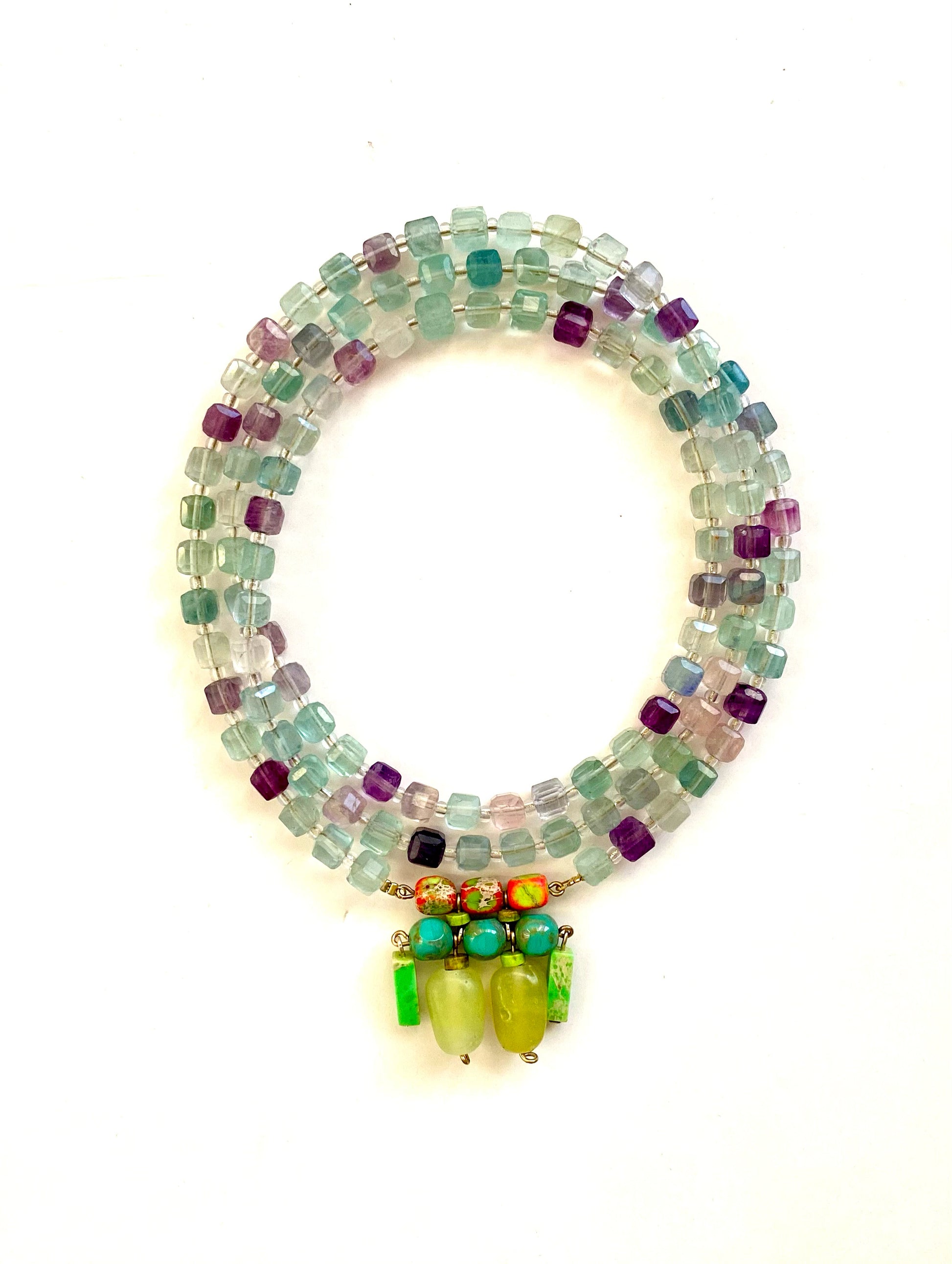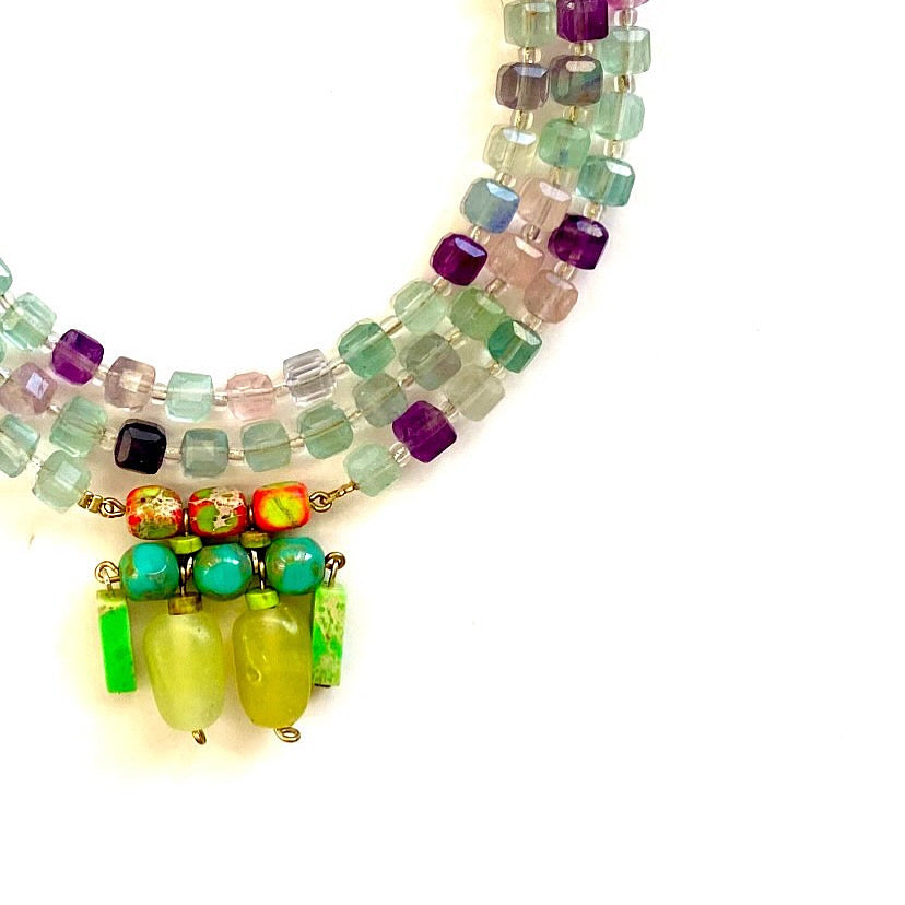 Como las olas suaves que acarician la orilla, este collar guarda la calma del océano y la belleza sencilla de lo cotidiano. Sus tonos verdes, lilas y turquesas invitan a caminar despacio, con el corazón ligero y la mirada abierta a la armonía de la vida.